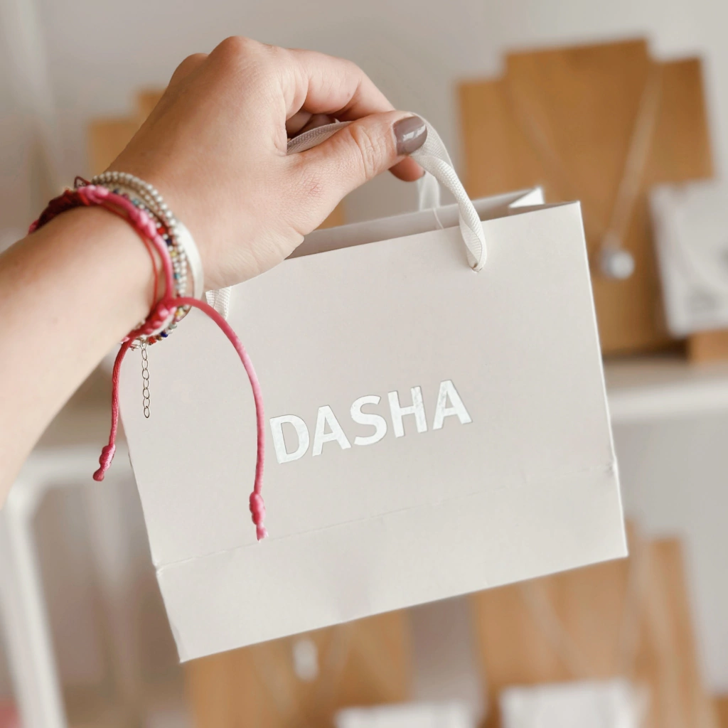 Bolsa de papel de 17 x 13 x 7 con manijas de cinta gross blanca y logo en hot stamping plata.