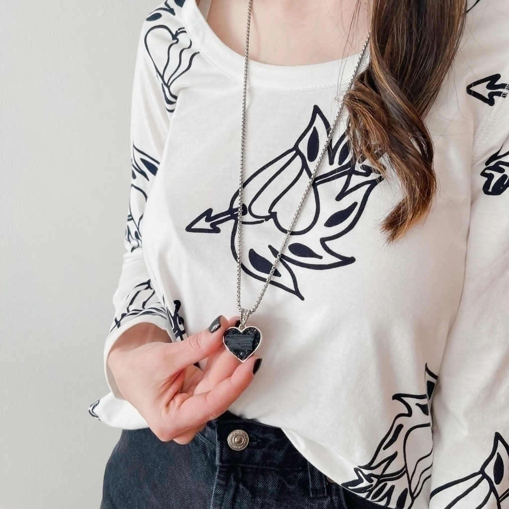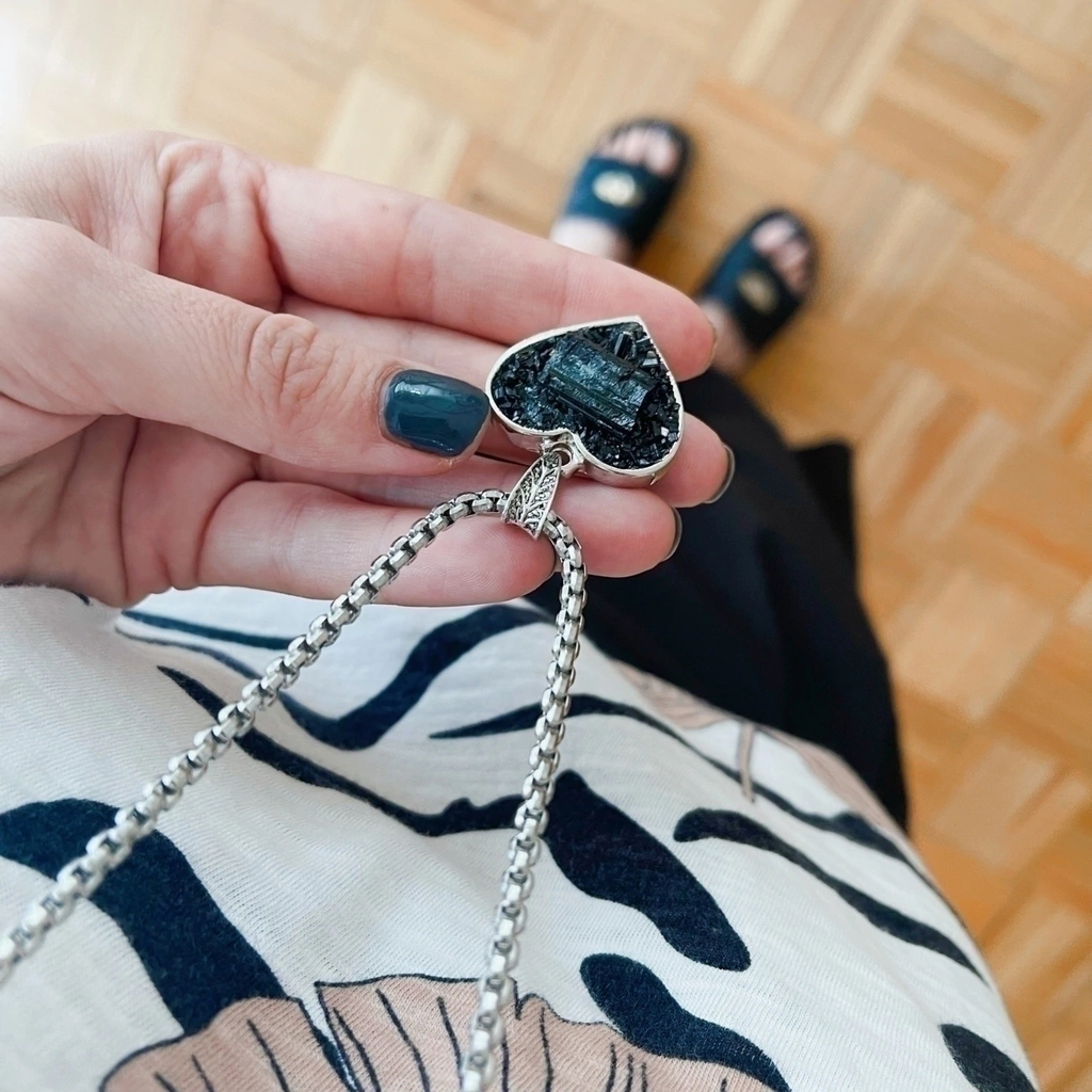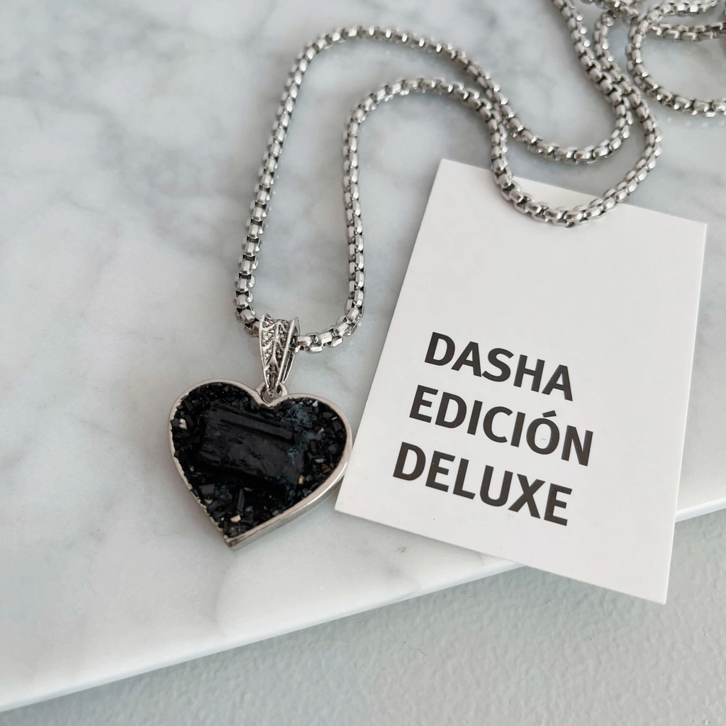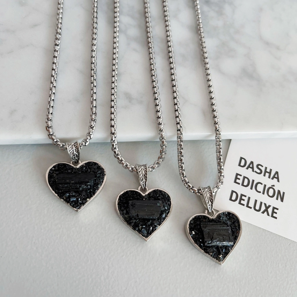 Collar de turmalina natural engarzada manualmente en Alpaca por nuestros orfebres en caja simple con forma de corazón.
