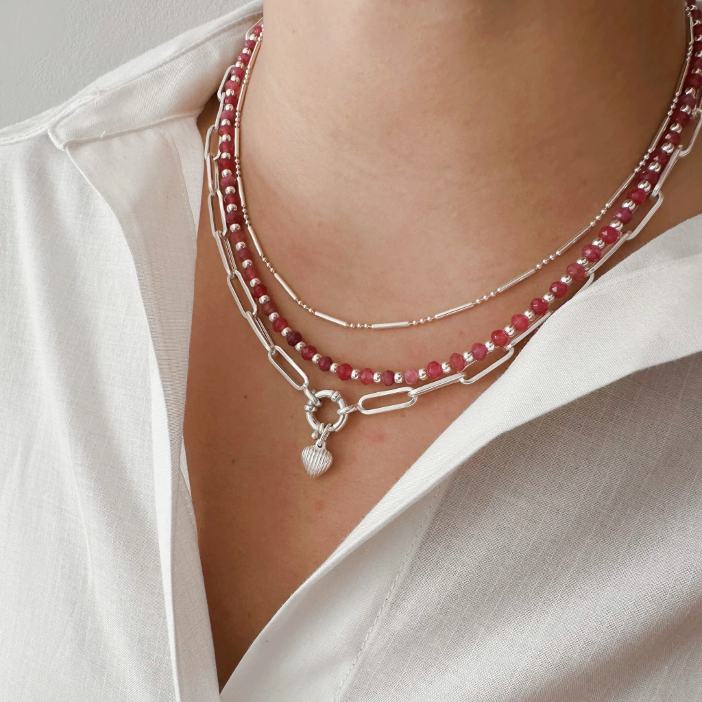 Nuestro collar Leia está hecho con micro cristales de ágata fucsia y bolitas de Plata 925.